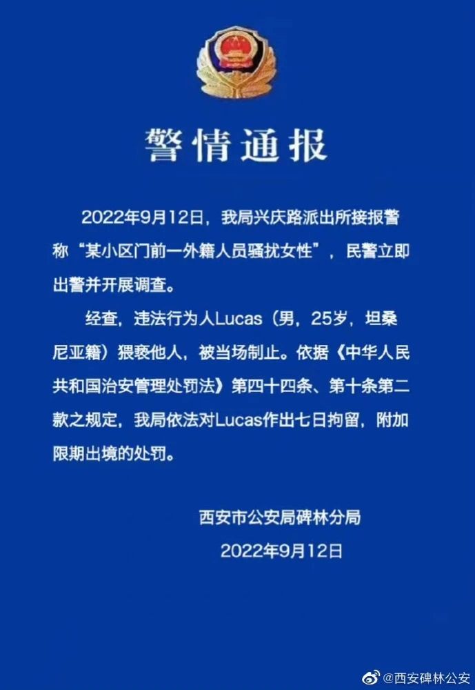 昨日(9月12日)西安碑林公安发布警情通报:2022年9月12日,我局兴庆路派出所接报警称“某小区门前一外籍人员骚扰女性”,民警立即出警并开展调查。 经查,违法行为人Lucas(男,25岁,坦桑尼亚籍)猥亵他人,被当场制止。依据《中华人民共和国治安管理处罚法》第四十四条、第十条第二款之规定,我局依法对Lucas作出七日拘留,附加限期出境的处罚。 |