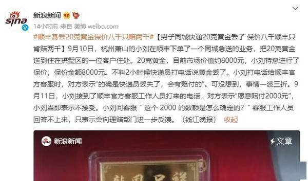 得益于顺丰快递的品牌影响力、安全和快的品牌印象 ,多数用户在寄贵重物品或有很急的需求时会优先考虑它。不过,最近关于顺丰快递的负面事件也不少。近日,CNMO了解到,有网友表示,自己用顺丰寄出20克黄金,结果寄出不到2小时就丢了,而自己保价8千元,顺丰却只愿赔2千元。 顺丰快递 据报道,住在萧山的小刘要把20克黄金送到住在拱墅区的一位客户住处,他就在顺丰平台下单了一个同城急送的单子。20克黄金,目前市场价值约8000元,因此小刘特意进行了保价,保价金额为8000元。随后,快递员上门取件并进行了拍照,不过让小刘没想到的是,黄金在寄出不到2小时就丢了,快递员表示,他把黄金放在口袋里,上衣放在车上,然后去上厕所,回来就发现口袋里的黄金没有了。快递员还表示,已经和顺丰快递公司说过了,肯定有赔付的,自己也向派出所报了警。 媒体报道 小刘打电话给顺丰官方客服时,对方表示,的确是快递员丢失了,会进行赔付。令人意外的是,之后小刘接到了顺丰官方客服工作人员的电话,对方却表示,愿意赔付2000元。小刘当即表示不接受,便问客服:2000元的数额是怎么确定的? 客服工作人员回答不上来,只表示会向理赔部门进一步反馈,并表示会在4个小时后回电。但小刘后来一直没接到顺丰的反馈电话。 对此,小刘表示,选择顺丰就是因为看中这个响当当的品牌,自己保价金额是8000元,为什么赔付变成2000元,那保价意义何在;自己东西丢了,当然要按本来价值赔付,难道还要自己承担损失吗?是不是以后贵重的东西都得自己背来背去,都不敢快递了。 目前,事件还没有新的进展,CNMO将持续关注。 |