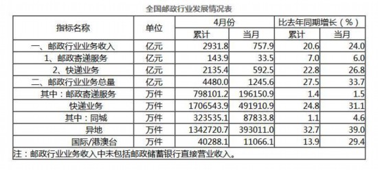 本网5月15日综合讯 国家邮政局14日公布2019年4月邮政行业运行情况。1-4月份,邮政行业业务收入(不包括邮政储蓄银行直接营业收入)累计完成2931.8亿元,同比增长20.6%;业务总量累计完成4480亿元,同比增长27.5%。 来源:国家邮政局官网 4月份,全行业业务收入完成757.9亿元,同比增长24%;业务总量完成1245.6亿元,同比增长33.7%。 1-4月份,邮政服务业务总量累计完成795.8亿元,同比增长19.8%;邮政寄递服务业务量累计完成79.8亿件,同比增长1.4%;邮政寄递服务业务收入累计完成143.9亿元,同比增长7%。 4月份,邮政服务业务总量完成187.7亿元,同比增长16.5%;邮政寄递服务业务量完成19.6亿件,同比增长1.5%;邮政寄递服务业务收入完成33.5亿元,同比增长6%。 来源:国家邮政局官网 1-4月份,全国快递服务企业业务量累计完成170.7亿件,同比增长24.8%;业务收入累计完成2135.4亿元,同比增长22.8%。其中,同城业务量累计完成32.4亿件,同比增长1.1%;异地业务量累计完成134.3亿件,同比增长32.7%;国际/港澳台业务量累计完成4亿件,同比增长13.9%。 4月份,全国快递服务企业业务量完成49.2亿件,同比增长31.1%;业务收入完成592.5亿元,同比增长26.8%。 1-4月份,同城、异地、国际/港澳台快递业务量分别占全部快递业务量的19%、78.7%和2.3%;业务收入分别占全部快递收入的10.7%、52.1%和10.2%。与去年同期相比,同城快递业务量的比重下降4.4个百分点,异地快递业务量的比重上升4.7个百分点,国际/港澳台业务量的比重下降0.3个百分点。 1-4月份,东、中、西部地区快递业务量比重分别为79.8%、12.7%和7.5%,业务收入比重分别为80.3%、11.1%和8.6%。与去年同期相比,东部地区快递业务量比重下降0.4个百分点, 快递业务收入上升0.1个百分点;中部地区快递业务量比重上升0.7个百分点, 快递业务收入比重基本持平;西部地区快递业务量比重下降0.3个百分点,快递业务收入比重下降0.1个百分点。 1-4月份,快递与包裹服务品牌集中度指数CR8为81.5,较1-3月下降0.2个百分点。 从快递业务量来看,前十名城市依次分别为广州市、金华(义乌)市、深圳市、上海市、杭州市、北京市、苏州市、东莞市、成都市和揭阳市。从快递业务收入来看,前十名城市依次分别为上海市、广州市、深圳市、杭州市、北京市、东莞市、苏州市、金华(义乌)市、成都市和武汉市。 |