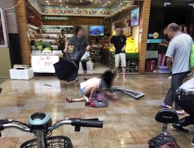 现场监控显示,一位女士牵着儿子从事发路段经过,突然,一扇带有窗框的玻璃窗从天而降,结结实实砸在男孩的头上,玻璃渣碎了一地,四周一片尖叫声。