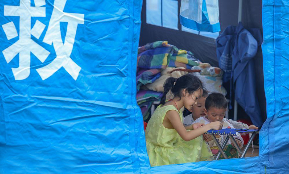 四川宜宾6.0级地震:2019年6月18日,三个小孩在帐篷中玩耍。