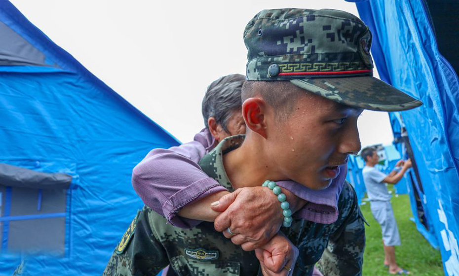 四川宜宾6.0级地震:2019年6月18日,武警战士背着受伤的老奶奶来到安置点。