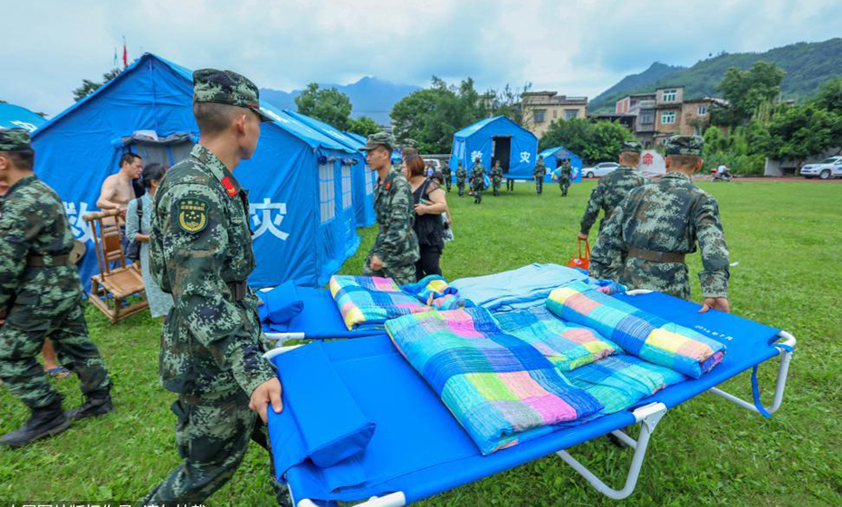四川宜宾6.0级地震:2019年6月18日,武警官兵为受灾群众布置安置点临时床铺。