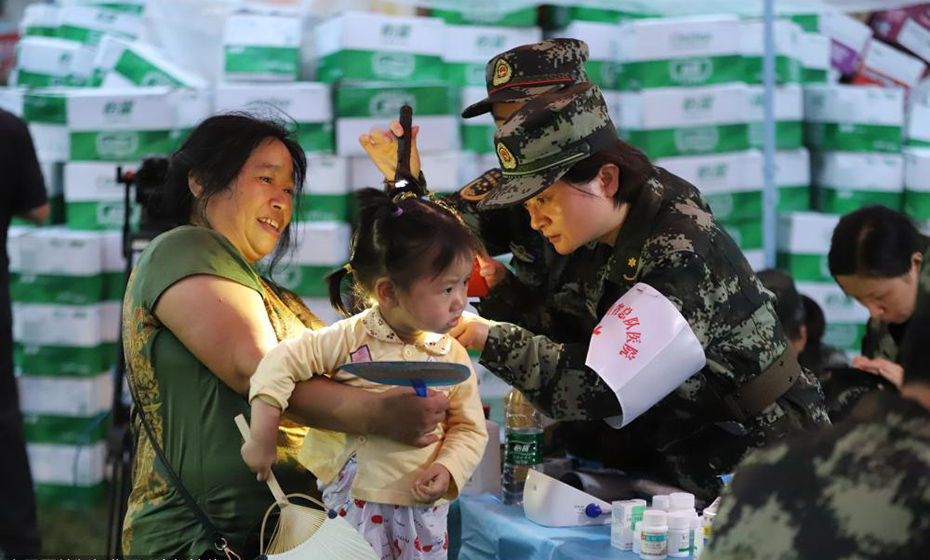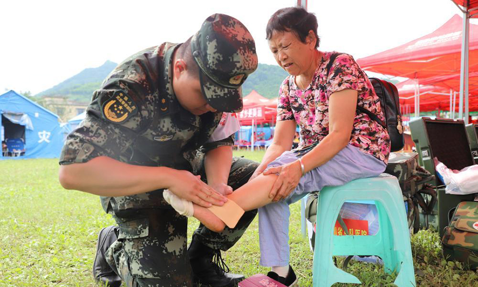 四川宜宾6.0级地震:6月18日,在长宁县双河镇双河中学安置点,武警四川总队医院医疗队队员为受伤群众治疗。