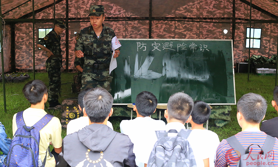 四川宜宾6.0级地震:6月18日,“帐篷学校”第一堂课由支队的军官给大家讲解,主要是对孩子们进行与地震相关的知识普及,告诉大家当地震来临时该如何逃生。人民网记者 朱虹/摄