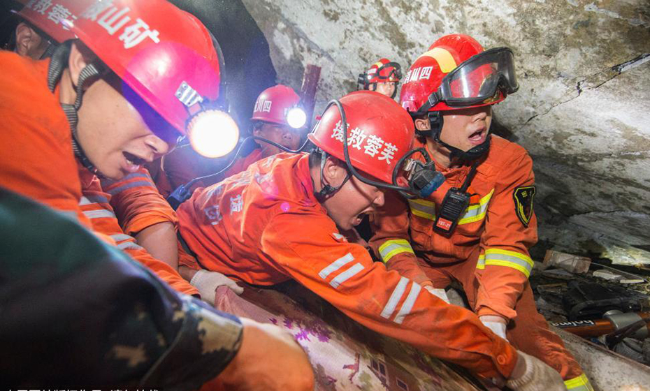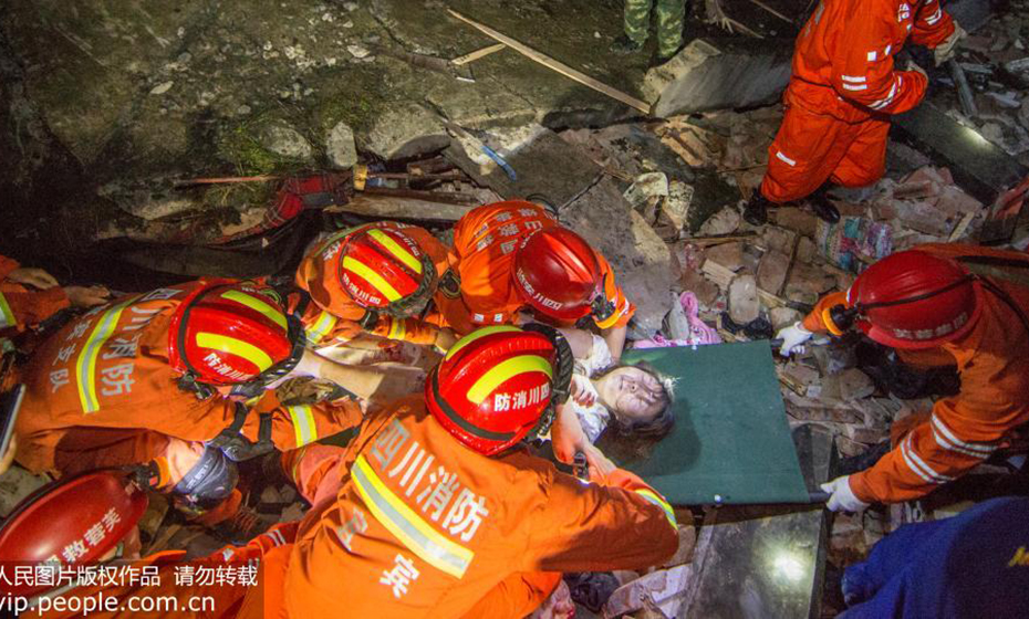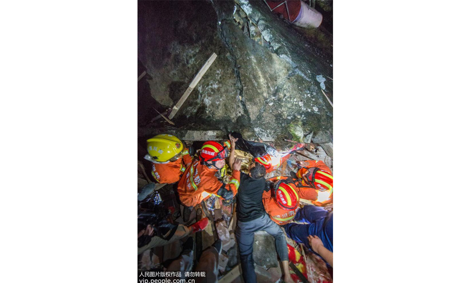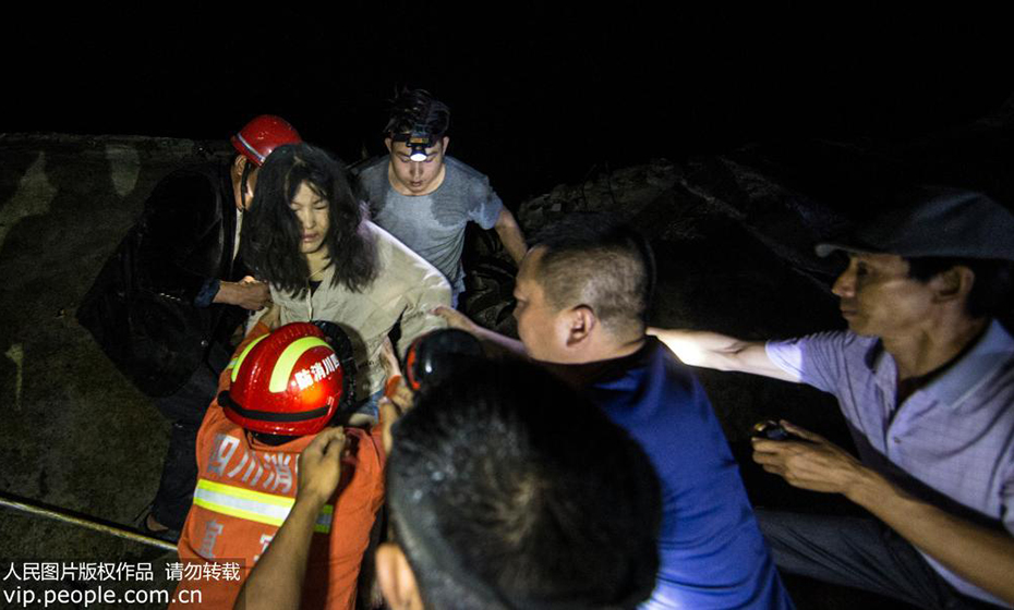 四川宜宾6.0级地震:6月18日,四川长宁县双河镇,废墟中救出受灾群众。胡鹏/摄