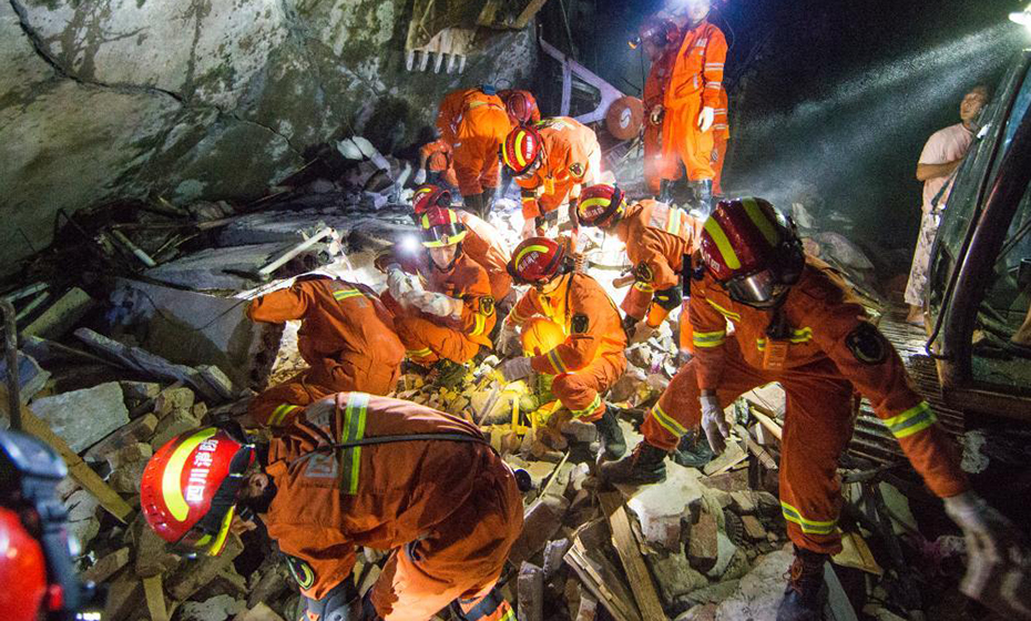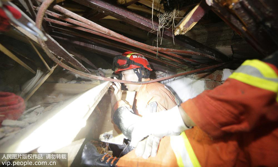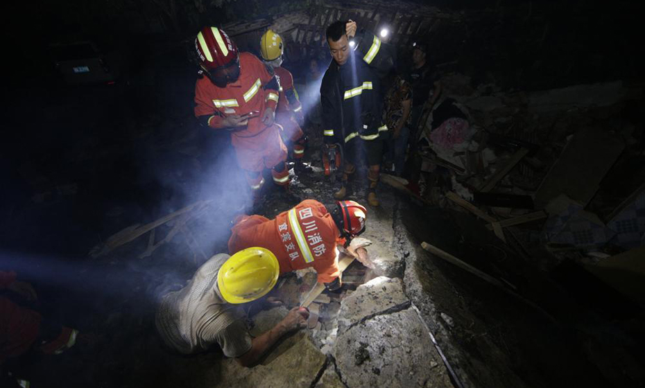 四川宜宾6.0级地震:6月18日,消防官兵在废墟上搜救。