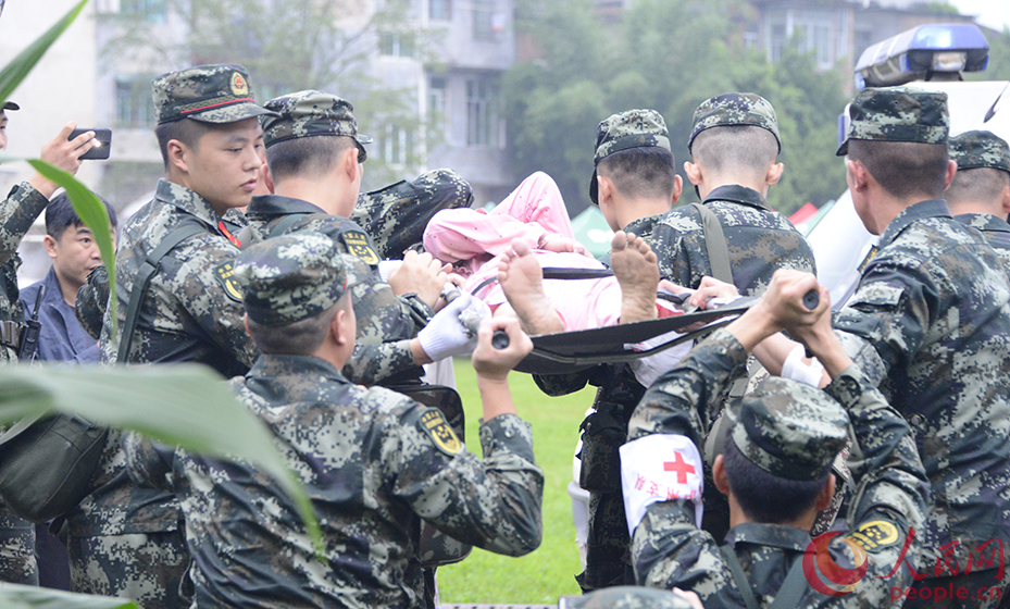 四川宜宾6.0级地震:6月18日,四川长宁县双河镇,武警官兵救援遇险群众。何芸潇/摄