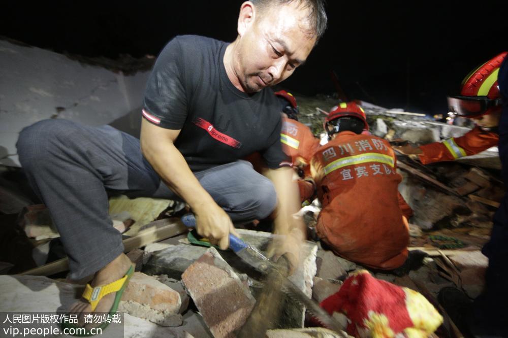 四川宜宾6.0级地震:6月18日,四川长宁县双河镇,消防官兵在坍塌房屋中挖掘救援通道。胡鹏/摄