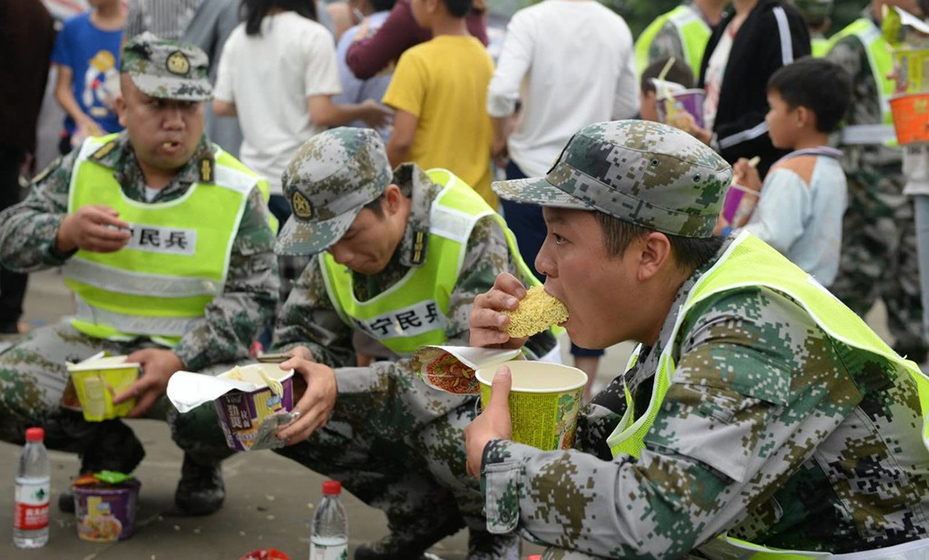 四川宜宾6.0级地震:把水留给群众!民兵蹲在地上干啃方便面。王效/摄