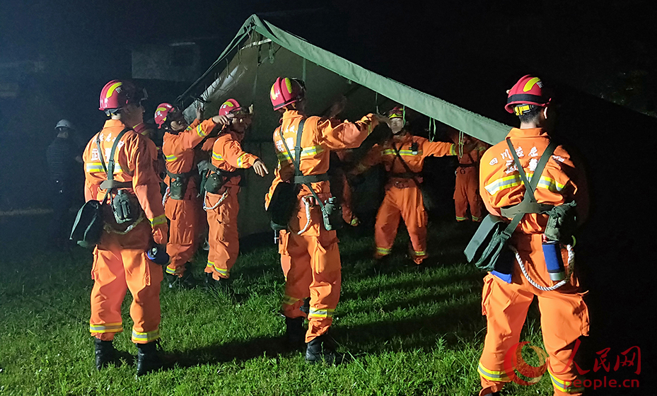 四川宜宾6.0级地震:6月18日,四川长宁县双河镇,消防官兵紧急搭建救援帐篷。何芸潇/摄
