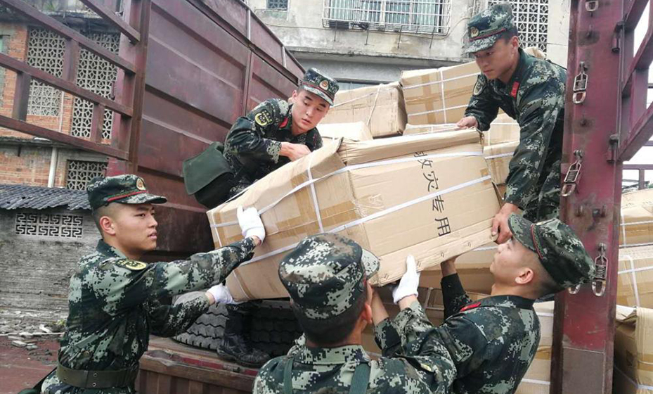 四川宜宾6.0级地震:武警官兵搬运紧急调配的物资。李华时/摄