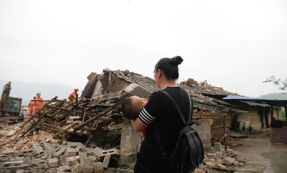 四川宜宾6.0级地震:6月18日,一位母亲怀抱孩子在废墟前。