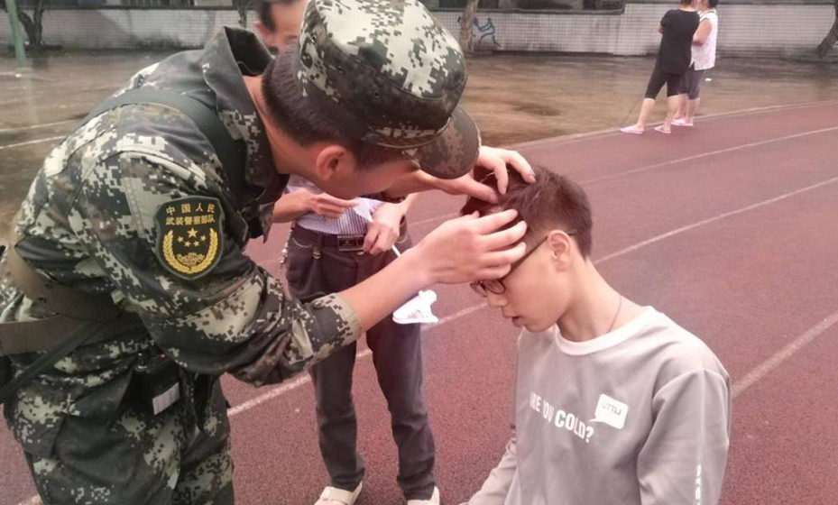 四川宜宾6.0级地震:武警官兵帮受伤的群众处理伤口。李华时/摄