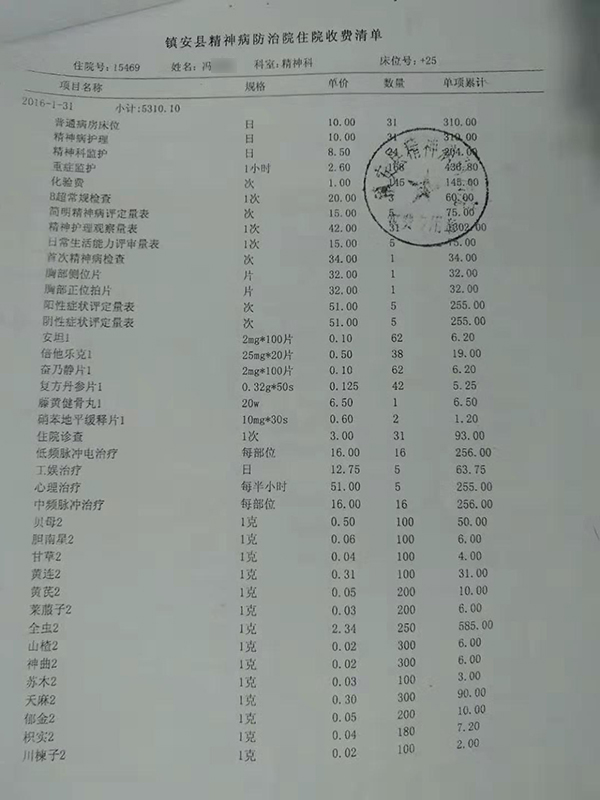 2015年11月16日至12月31日住院收费清单 据澎湃新闻7月18日报道,家住陕西商洛的冯斌向澎湃质量报告投诉平台(www.thepaper.cn/consumersComplaint.jsp)反映,2015年11月16日,其时年56岁的父亲因患精神分裂症,在镇安县精神病防治院住院两个多月。2016年1月31日出院后,因家里困难,一直拖欠医院部分医药费1.2万元至今。近日,冯斌被医院催缴欠费,细看收费清单时,发现该医院给其父开了600余千克(1200余斤)中药材,共计9000余元。该笔住院治疗费用已通过柞水县新型农村合作医疗经办中心进行报销。 镇安县精神病防治院为冯斌父亲开了两张收费清单。2016年1月10日开具的收费清单显示,患者使用中药材“莱菔子1”400千克,每千克15元,共计费用6000元;“川楝子1”200千克,每千克15元,共计费用3000元。