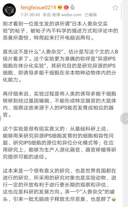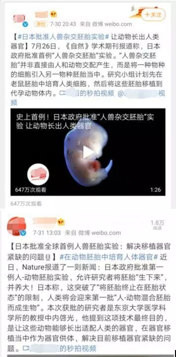 ▲图为引发争议的“人兽杂交”新闻 科普账号@fengfeixue0219就对网络上充斥着的“人兽杂交”的说法表示了强烈的不满。 他介绍说,日本科学家进行的这种实验根本不是一些影视作品中所表现的依靠交配进行的“人兽杂交”,而是将一种名为iPS的细胞注入到不会生长某些器官的动物的胚胎内,以实验看这种细胞能否在这种动物体内长出相应的器官,从而为探索人体器官移植方面的研究提供重要的数据。