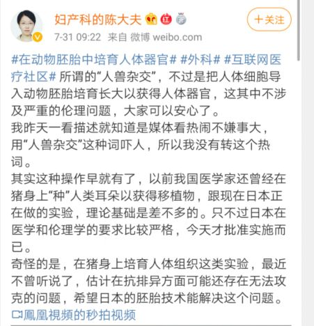 另一个名为@妇产科的陈大夫 的科普账号也持同样的观点,表示所谓的“人兽杂交”实验不过是把人体干细胞导入到动物胚胎内,然后等动物胚胎发育长大后看能否长出人体的器官,以用于研究人体的器官移植问题。 这个科普账号还指出,这种实验其实早就有了,比如以前中国的科学家就搞过在猪的身上做过“种”人体耳朵的实验,虽然与在胚胎阶段注入人体细胞进行研究有所不同,但理论基础是差不多的。所以,该账号也认为“人兽杂交”一说不过是一种媒体“看热闹不嫌事大”而抛出一种噱头。