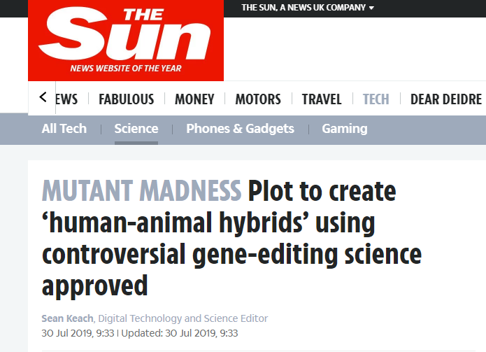 ▲英国小报“太阳报”也在无知地将这一科研炒作成是“疯狂的变种”和“人兽杂交” 但话说回来,在面对这种尖端的、触及人类未知领域的科学研究时,人们也应当持有谨慎和批判的态度。只不过这种批判应出于对研究的认真负责和实事求是。实际上,日本东京大学和京都大学都曾曝出过围绕iPS细胞实验过程中的数据造假问题。确保这类问题不再出现,才是我们对科学的应有之义。