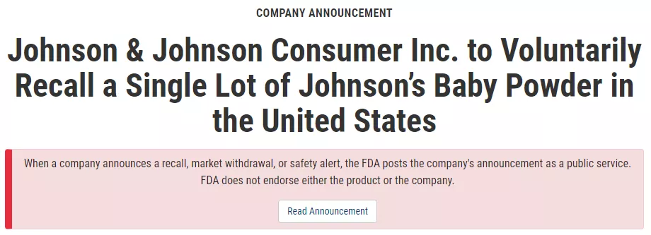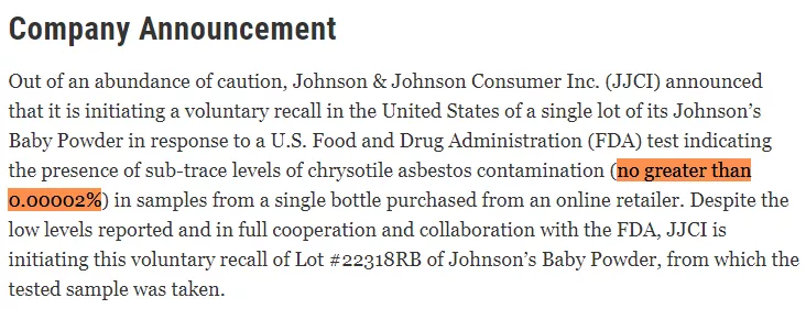 值得一提,这是强生首次因石棉问题召回自家婴儿爽身粉。同时也是美国政府首次在强生产品中发现石棉。