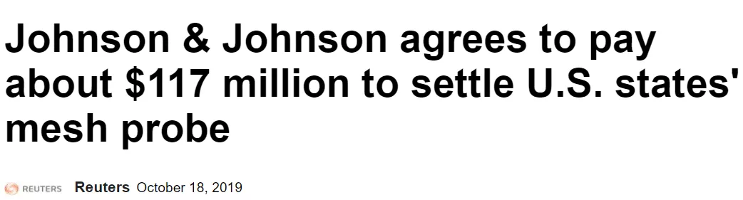 除滑石粉类产品外,强生所销售的盆骨网膜植入手术相关产品,曾导致患者大出血,被全美41州检方提起诉讼。强生刚于10月17日和被告达成和解,决定赔偿1.17亿美元。