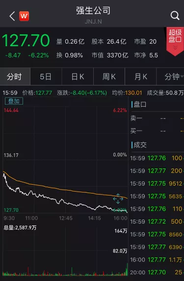 市场方面,强生昨日股价大跌,收盘跌幅为6.22%,报127.7美元/股。目前市值为3370亿美元。