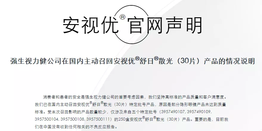 不久前的9月26日,英国药监机构MHRA发文称,强生公司正在召回部分不良隐形眼镜,涉事产品存在危险颗粒物,可能导致使用者眼睛发红、不适等症状。强生被召回产品为强生“安视优舒日散光日抛型隐形眼镜”,主要涉及3个批次。强生中国方面表示,部分产品在内地也有销售,目前部分安视优散光类日抛隐形眼镜正在召回。