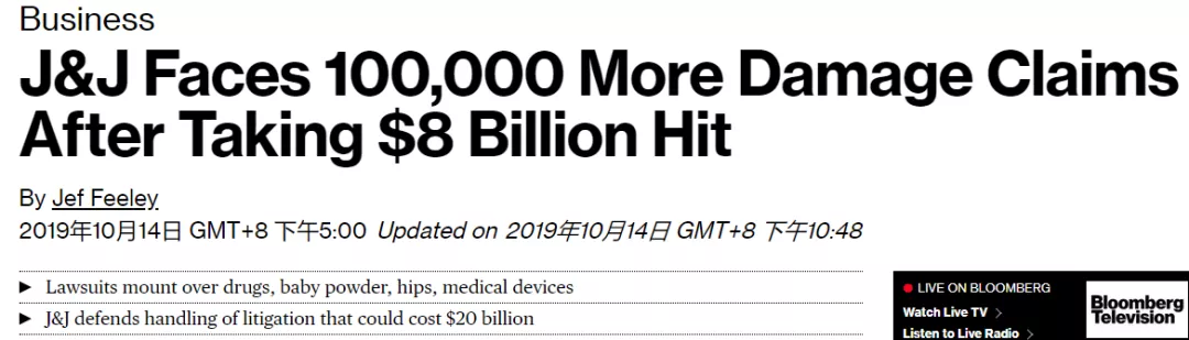 彭博社报道称,目前总计强生因其产品问题所面临的诉讼,高达10万起。