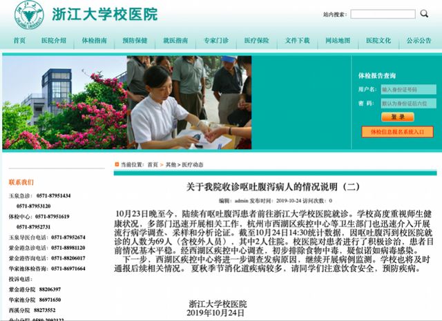 通报指出,10月23日晚至今,陆续有呕吐腹泻患者前往浙江大学校医院就诊。学校多部门迅速开展相关工作,杭州市西湖区疾控中心等卫生部门也迅速介入开展流行病学调查、采样和分析论证。