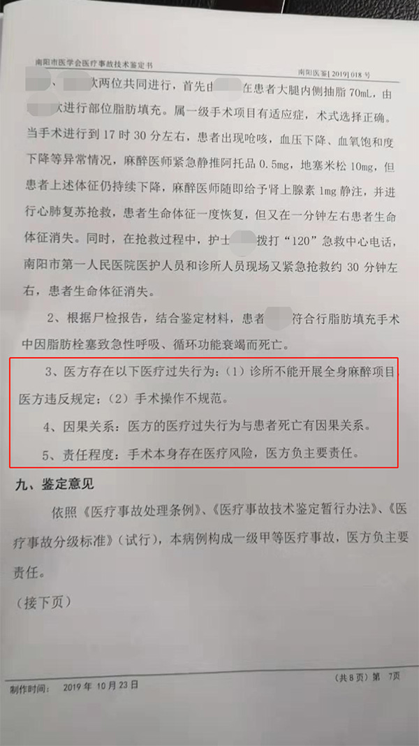 10月28日下午,死者小A(化名)丈夫张先生向澎湃新闻(www.thepaper.cn)出示的由南阳市医学会出具的医疗事故技术鉴定书显示,该病例构成一级甲等医疗事故,医方存在“诊所不能开展全身麻醉项目,医方违反规定;手术操作不规范”的医疗过失行为,手术本身存在医疗风险,医方负主要责任。
