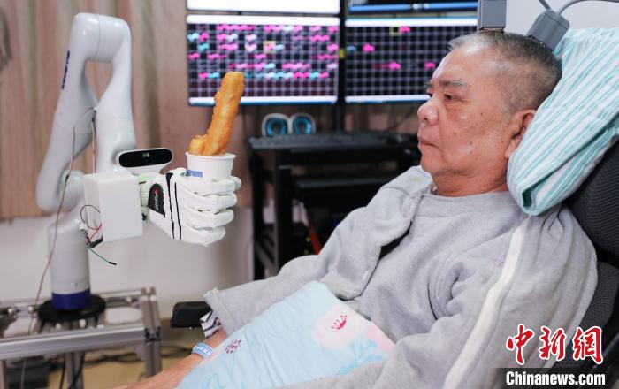 图为高位截瘫患者张先生用“意念”吃油条 浙大供图 摄