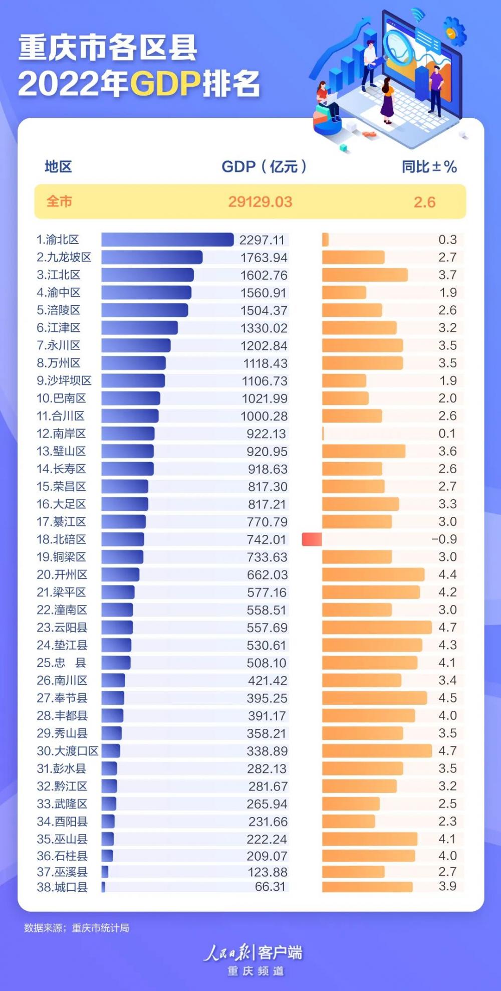 从总量来看,前5名依次为渝北区、九龙坡区、江北区、渝中区、涪陵区,均超过1500亿元。 渝北区继续保持第一,是唯一一个GDP超过2000亿元的区县。 共有11个区县GDP超过1000亿元,其中,巴南区超越合川区,跻身前十;在中心城区之外,涪陵区、江津区、永川区保持前三。 从增速来看,大渡口区、云阳县增速最快,同比增长4.7%,开州、梁平、巫山等地增速超4%;北碚区负增长0.9%,是唯一一个出现负增长的区县。