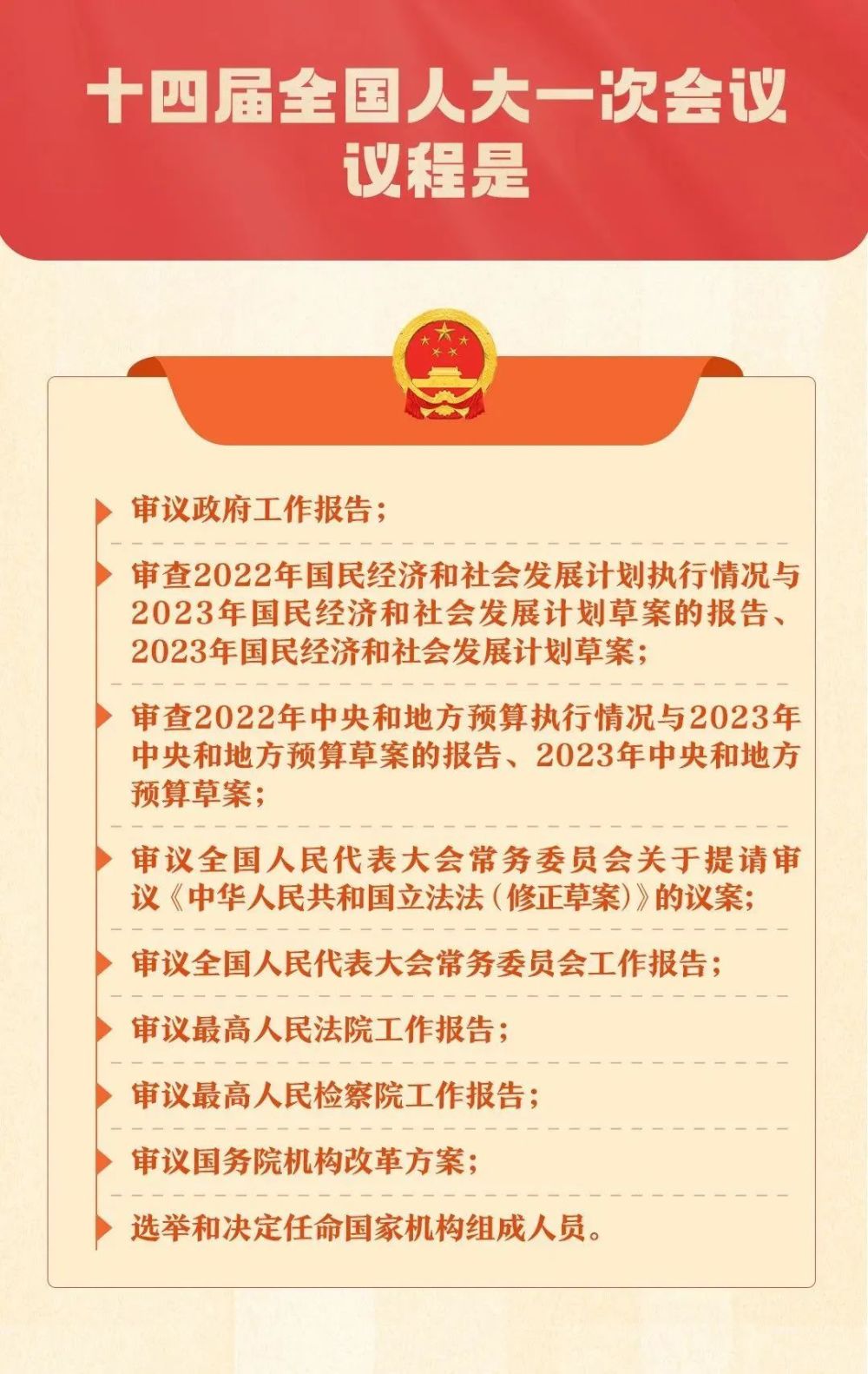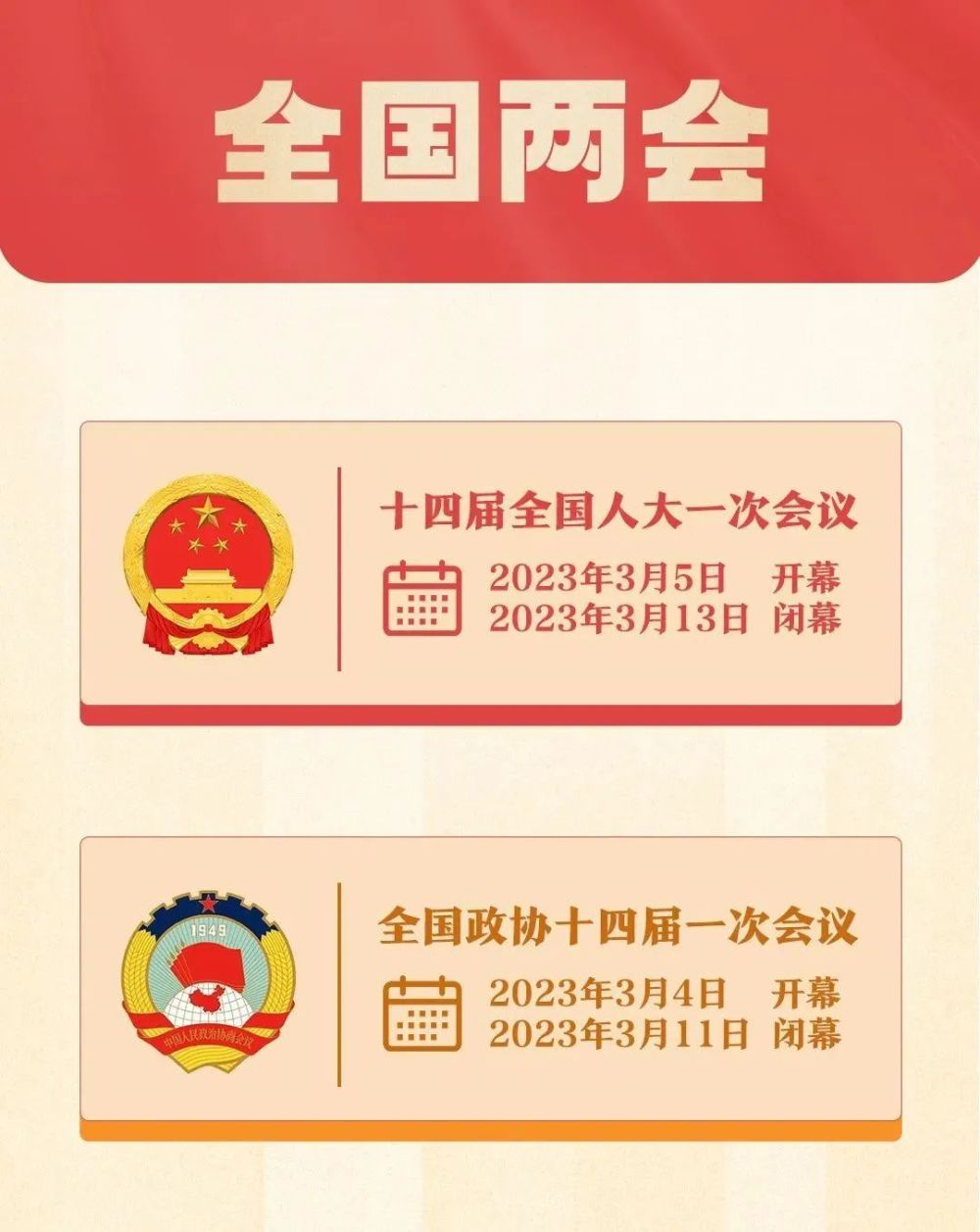 两会时间已开启!关于全国两会,你了解多少?代表、委员是如何产生的?议案、提案等表述该如何区分?作为在全面贯彻落实党的二十大精神开局之年召开的重要会议,今年的两会又有哪些议程?快来看图一起学习两会知识吧。 会议议程 3月4日12:00 人大新闻发布会 3月5日8:00 第一场“代表通道” 3月5日9:00 人大会议开幕式 3月5日下午 各代表团全体会议 3月6日9:00 代表小组会议 3月6日15:00 代表小组会议 3月7日9:00 代表小组会议 3月7日上午 记者会 3月7日15:00 代表大会有第二次全体会议 3月8日9:00 代表小组会议 3月8日 15:00 代表小组会议 3月9日15:00 代表团全体会议 3月10日9:00 代表大会第三次全体会议 3月10日15:00 代表团全体会议 3月11日9:00 代表大会第四次全体会议 3月11日15:00 代表团全体会议 3月12日9:00 代表大会第五次全体会议 3月12日 15:00代表小组会议 3月13日9:00 人大会议闭幕式 政协日程 3月3日16:30 政协新闻发布会 3月4日14:05 第一场“委员通道” 3月4日15:00 政协会议开幕式 3月5日9:00 列席人大会议开幕式 3月7日上午 第二场“委员通道” 3月11日下午 政协会议闭幕式 (来源:央视新闻公众号) |