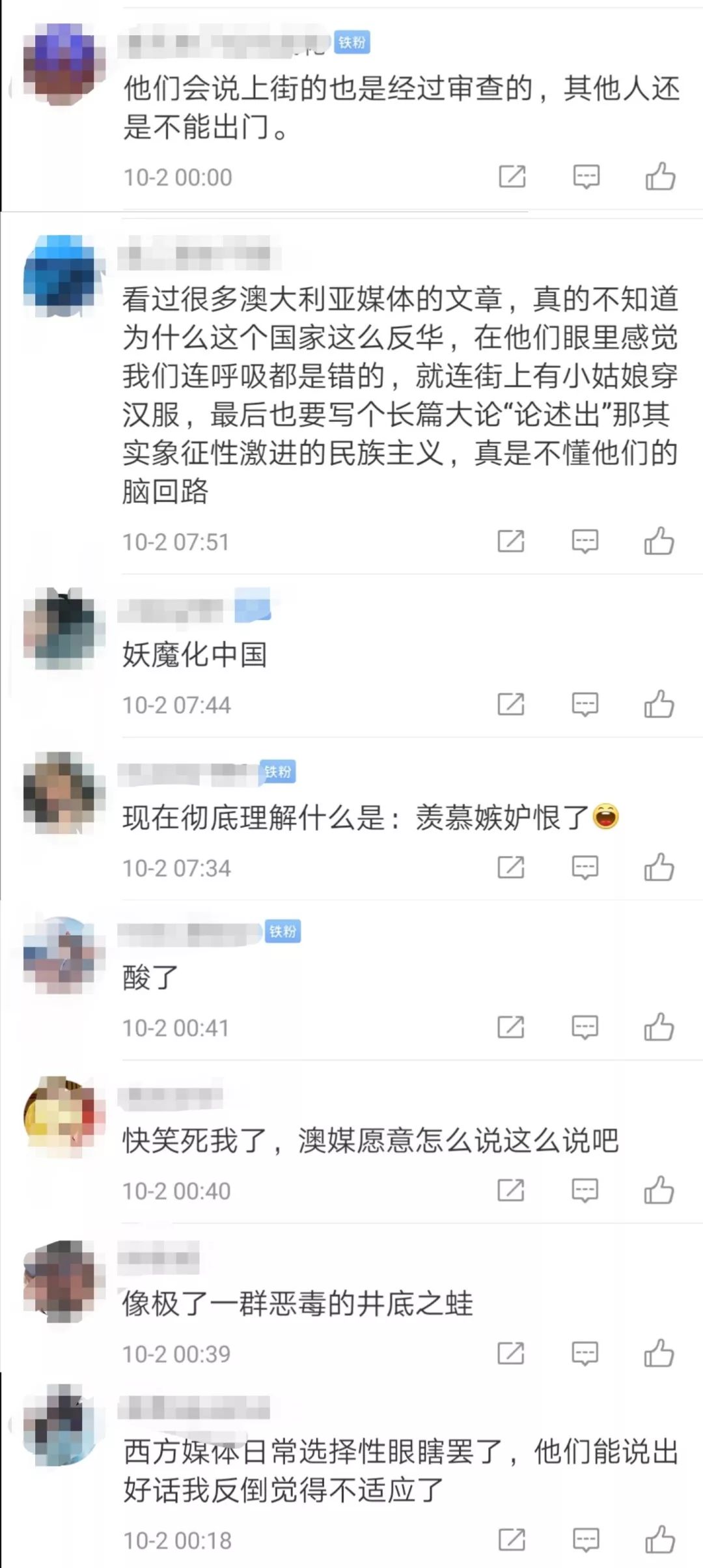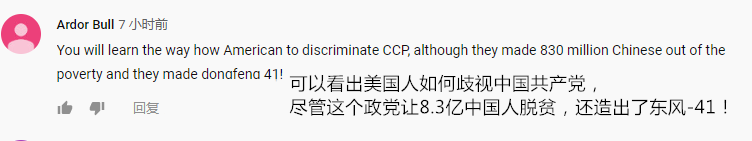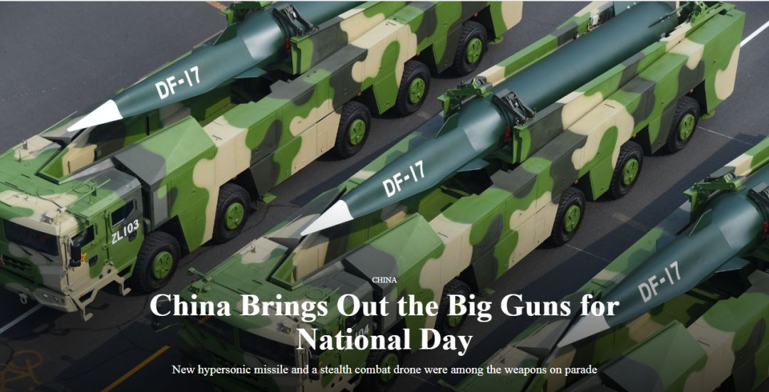 10月1日上午 庆祝中华人民共和国成立70周年大会 在北京天安门广场隆重举行 这次阅兵 是近几次阅兵中规模最大的一次 方队数量创历史新高 受阅装备近半数是全新亮相 让看直播的小军 几次内牛满面 在这个中华大地普天同庆的日子里 世界的目光 同样向欢腾的中国聚焦 那么 我们眼里繁荣富强的盛世中华 在部分西方媒体和民众眼中 到底是什么样的呢? 一个词概括:“五味杂陈” 具体点就是:“羡慕嫉妒恨” …… 01 西方媒体 看完直播后,心潮澎湃的你一定好奇 外媒是怎么报道咱们这次大阅兵的? 很幸运又或不幸地告诉你 他们一如既往 延续了“妖魔化中国”的一贯作风: 这种充满恶意的编造 不仅看起来可笑 连基本的新闻真实的道德底线 都被践踏得无影无踪 当然,中外群众的眼睛是雪亮的 西媒的编造很快遭到了网友嘲讽: 我们知道 长期以来 西方媒体都在不遗余力地 妖魔化中国 污蔑中国 oppressive, hegemony, brainwashing 即便如此 我们一方面要明白 帝国主义亡我之心不死 同时也应该庆幸 这印证了毛主席的一段话: “我认为,对我们来说,一个人,一个党,一个军队,或者一个学校,如若不被敌人反对,那就不好了,那一定是同敌人同流合污了。如若被敌人反对,那就好了,那就证明我们同敌人划清界线了。如若敌人起劲地反对我们,把我们说得一塌糊涂,一无是处,那就更好了,那就证明我们不但同敌人划清了界线,而且证明我们的工作是很有成绩的了。”(《被敌人反对不是坏事而是好事》一九三九年五月二十六日) “I hold that it is bad as far as we are concerned if a person, a political party, an army or a school is not attacked by the enemy, for in that case it would definitely mean that we have sunk to the level of the enemy. It is good if we are attacked by the enemy, since it proves that we have drawn a clear line of demarcation between the enemy and ourselves. It is still better if the enemy attacks us wildly and paints us as utterly black and without a single virtue; it demonstrates that we have not only drawn a clear line of demarcation between the enemy and ourselves but achieved a great deal in our work.” To Be Attacked by the Enemy Is Not a Bad Thing but a Good Thing (May 26, 1939) 02 西方民众 或许你会猜想 看了这么雄伟壮阔的阅兵 西方民众是否同样会感到振奋? 的确 有很多可爱的国际友人前来道贺: 但也有不少无脑无知的评论: 如果说 西方媒体妖魔中国 还是清醒的、有意识的 那么部分西方民众 对中国的成见和敌意 恐怕就是下意识的了 因为他们是西方媒体制造的产物 他们虽未曾踏足中国半步 却对自己的认识深信不疑: “I learned all these things from school.” 你或许在想 西方媒体和民众的这些反应 是不是真的? 为什么会这样?! 小军认为 法国人Kevin D. Aslan的一段话 揭露了部分答案: Every country has something going wrong with it. In the US and Western Europe, the biggest problem right now is employment, and the disappearance of manufacturing jobs. There have been a lot of scapegoats used recently. For the US in particular, it’s been China and Mexico. Blame the politicians and the media for diverting attention towards China. 每个国家都正经历着一些坏事。在美国和西欧,目前最大的问题就是就业率和制造业工作的流失。欧洲国家用了很多替罪羊,而对于美国,他们的替罪羊则是中国和墨西哥。所以真正应该被谴责的,是那些玩弄民意嫁祸中国的政治家和媒体。 03 西方专家 这次阅兵 相信大家最振奋的 就是新披露的各种新式武器了 而对于西方军队、专家来说 他们最关注的却是 中国的军力是否又有新动向? 于是乎 他们夜不能寐,擦亮眼睛 盯着中国阅兵的每一个细节 Governments around the region and foreign military experts watched the parade closely for signals about China’s military achievements, looking for clues about weapon capabilities and evidence of new systems. 周边各国政府和外军专家在紧盯着这场阅兵,想从中得知中国军事成就的迹象、装备实力的线索和新武器的证据。(路透社) (《华尔街日报》贴出的标题图是超高清的东风-17高超音速弹道导弹) 那么,他们“盯”出了什么成果? 有否坐立不安呢? 一起来看看吧! 【DF-17 Hypersonic Missiles】 东风-17高超音速弹道导弹 法国智库基金会的分析家Antoine Bondaz和Stephane Delory发表研究报告说: The display of the DF-17 would highlight China's progress in designing hypersonic non-strategic gliders, a segment in which Russians and Americans are lagging behind. (《海峡时报》) DF-17的出现说明了中国在设计高超音速非战略滑翔体上所取得的成绩,而在这方面俄罗斯人和美国人已经落后于中国。 悉尼洛威研究所国际安全计划主任山姆•罗格芬表示: “There's simply nothing like it in any Western military force,” said Sam Roggeveen “China is now, in some spheres of military technology, ahead of any Western nation.” (《华尔街日报》) “西方军队中根本没有这类东西。” “在某些军事技术领域,中国现已领先于所有西方国家。” 日本大学教授、日本陆上自卫队退役少将吉野希(Nozomu Yoshitomi)说: The DF-17 posed serious questions about the effectiveness of the regional missile defense system the United States and Japan are building. (路透社) 东风-17的出现,让美日正在建设的区域导弹防御系统是否有效成了个大问题。 “There is a possibility that if we do not acquire a more sophisticated ballistic missile defense system, it will become impossible for both the United States and Japan to respond,” Yoshitomi said. 