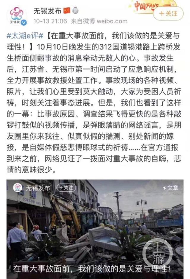 10月10日傍晚6点10分左右,江苏省无锡市312国道上海方向K135处、锡港路上跨桥出现桥面侧翻,造成3人死亡,2人受伤。10月13日晚,无锡官方微博发布《在重大事故面前,我们该做的是关爱与理想》评论称,在官方通报到来之前,网络见证了“各种敲锣打鼓似的视频传播,是弹眼落睛的网络谣言,是自媒体假慈悲博眼球式的祈祷……” 这条评论再次引发网络舆情,饱受批评。 据此前媒体报道,10月10日事故发生后,第一时间以微博、微信等网络平台便有大量现场视频、图片流出并广泛传播,其中不仅包含事故现场情况,也涉及了家属失联、货车超载等相关信息。事故伤亡人数、事故初步核查原因成为公众最关心的话题,与之相关的追问随之而来。 无锡发布刊发这条饱受争议的评论后不到半小时就进行了删除。图片来源/微博截屏 根据《突发事件应对法》及《江苏省全面推进政务公开工作实施细则》等相关法律规定,应对突发事件,履行统一领导职责或者组织处置突发事件的人民政府,应当按照规定统一、准确、及时发布事态发展和应急处置工作的信息。对涉及特别重大、重大突发事件的政务舆情,要力争在3小时内、最迟不超过5小时发布权威信息,24小时内举行新闻发布会,主要负责人要带头发声。 在此次事故中,面对媒体、公众对事故救援、人员伤亡、事故原因的关注,无锡官方的通报姗姗来迟,首次以无锡市级官方发布消息的时间是在事故发生后的11个小时后,遭到公众诟病。 此后,10月14日无锡官方微博在《在重大事故面前,我们该做的是关爱与理想》的评论再次引发网络舆情,仅半个小时左右,该评论就被删除。 在重大事故面前,政府不发声或发布迟缓,往往是导致“惯性质疑”持续发酵,甚至有未经证实的传言趁机混淆视听现象发生的主因,也对政府形象造成恶劣影响。 如何正视舆论影响力?如何学会在突发事件、公共事件中,及时主动发布权威信息,平稳社会情绪,避免谣言散播?这应该成为政府部门的必修课。 在这门必修课中,政府部门首先要确定新闻发言人责任,对于公众、媒体关注的问题,及时掌握有关的数字、时间、相关领域知识等基本事实,做到及时、准确发布最新动态“跑”在最前面,以敬畏之心回应社会关切。此外,还要辅以严厉的问责制度,确保相关法规的落实到位。 来源:上游新闻 |