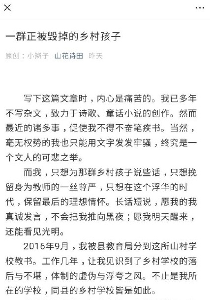 湖南永顺县山村小学女教师李田田日前写了一篇公号文章,反映她亲历的农村教育怪现状,包括为了迎接考察、评选,组织学生停课打扫卫生,指派教师放下教学工作去扶贫等。 10月15日深夜十点多,李田田发朋友圈寻求紧急帮助,称县教育局长让她连夜赶去说明情况。事情发展陡然间急转直下,李田田老师的职业遭遇令人关切。 来源:狐度 |