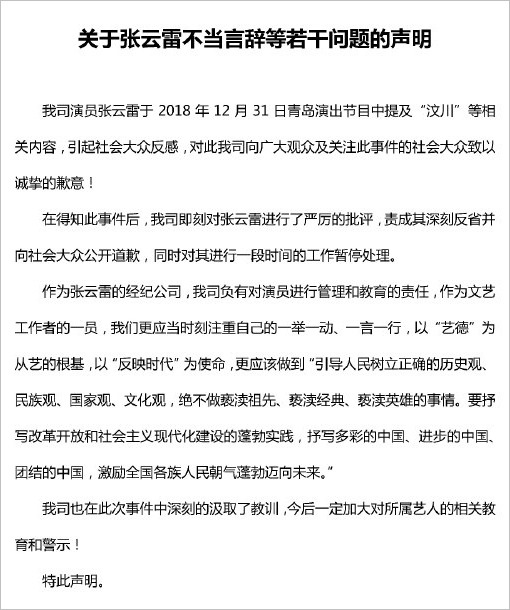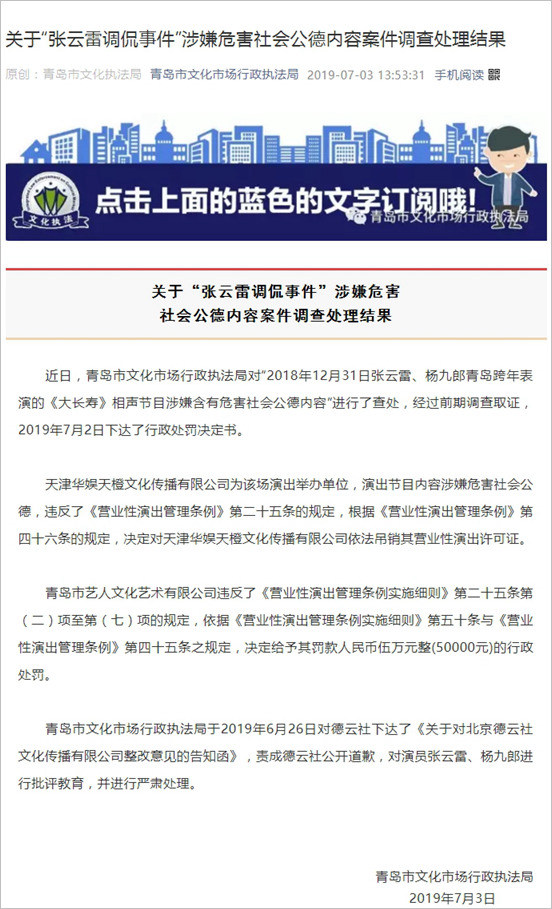 今年5月,德云社演员张云雷、杨九郎在青岛演出时的一段相声视频在网络热传。这段于2018年年底演出的相声节目中提及“汶川”“慰安”等相关内容,引发质疑。 网传视频截图 7月3日,青岛市文化执法局在其微信公众号中公布了该事件的调查处理结果:举办单位被吊销营业许可证,演出公司被罚款五万元。而德云社被责成公开道歉,对演员张云雷、杨九郎进行批评教育,并进行严肃处理。 上述调查处理结果公布后,德云社于3日下午2:40通过微博发布声明,向广大观众道歉,表示公司已对张云雷进行了严厉批评,责成其深刻反省并向社会大众道歉,同时将对他的工作暂停一段时间。 青岛市文化市场行政执法局调查处理结果全文如下: 近日,青岛市文化市场行政执法局对“2018年12月31日张云雷、杨九郎青岛跨年表演的《大长寿》相声节目涉嫌含有危害社会公德内容”进行了查处,经过前期调查取证,2019年7月2日下达了行政处罚决定书。 天津华娱天橙文化传播有限公司为该场演出举办单位,演出节目内容涉嫌危害社会公德,违反了《营业性演出管理条例》第二十五条的规定,根据《营业性演出管理条例》第四十六条的规定,决定对天津华娱天橙文化传播有限公司依法吊销其营业性演出许可证。 青岛市艺人文化艺术有限公司违反了《营业性演出管理条例实施细则》第二十五条第(二)项至第(七)项的规定,依据《营业性演出管理条例实施细则》第五十条与《营业性演出管理条例》第四十五条之规定,决定给予其罚款人民币伍万元整(50000元)的行政处罚。 青岛市文化市场行政执法局于2019年6月26日对德云社下达了《关于对北京德云社文化传播有限公司整改意见的告知函》,责成德云社公开道歉,对演员张云雷、杨九郎进行批评教育,并进行严肃处理。 来源:人民网-山东频道