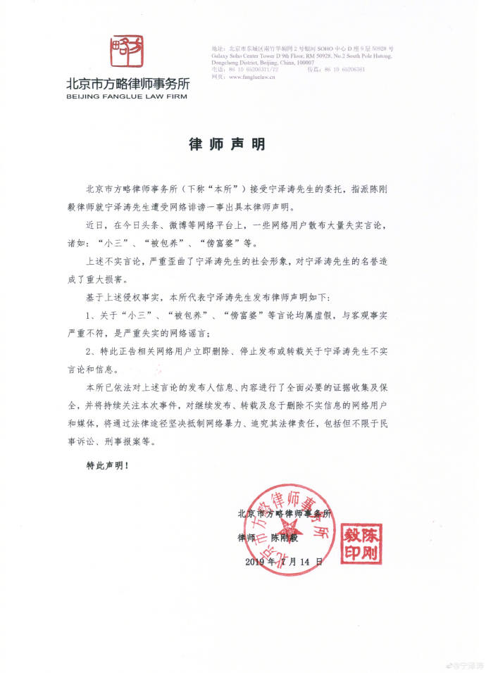 7月14日,游泳运动员宁泽涛在其个人微博上发布律师声明,称近日在网络平台上,一些网络用户散布大量失实言论,诸如“小三”、“被包养”、“傍富婆”等。对此,律师所代表宁泽涛发布声明,称上诉言论均属虚假谣言,要求相关网络用户立即删除,停止发布或转载关于宁泽涛不实言论和信息。 来源:新京报 |