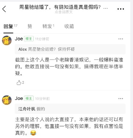 而在评论下方,也有网友表示:“如果你能放有可信度的照片,我或许就信了”,而对于网友的质疑,该娱记则是表示:“没有如果”,再次确认了周星驰刚刚结婚的事实。