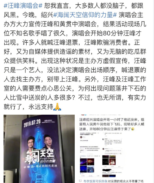 搜狐娱乐讯 7月20日晚,有不少网友发文爆料称汪峰举办演唱会却迟迟未现身,直到80多分钟后才登台,导致现场观众大喊“退票”,引发争议。不过也有网友表示这是汪峰与黄贯中的合作演唱会,并非其个人演唱会,与主办方的安排有关联。