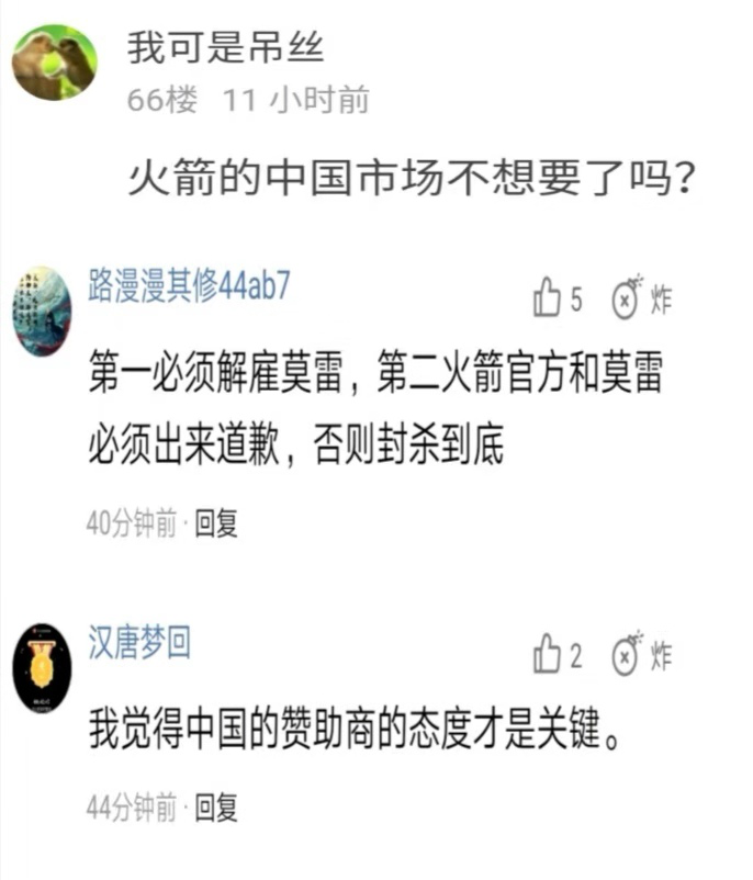 火箭队主场刚打出“庆祝中华人民共和国成立70周年”的标语,转头莫雷就公开发表支持香港暴力分子的言论,如此虚情假意,遭到中国球迷强烈抗议。“中国领土一刻也不能分割!虽然从姚明时代过后对火箭是一种情怀,但是在国家面前请你靠后!”“在莫雷被解雇前我绝不会再看一场火箭队比赛,我保证。” 不久后莫雷的推特账号删除了相关内容。对于莫雷的言论,火箭队老板菲尔蒂塔5日紧急发布推特澄清:“听着……莫雷不能代表休斯顿火箭队。”但火箭老板随后又发了一条,称“莫雷是一个好经理,球队与政治无关。” 中国网友并不买账,强烈要求火箭队正式道歉。“火箭老板回复的也是不疼不痒!根本没有直接表明球队的态度!” “如果这人不开除,火箭队不道歉,建议中国公司永远与火箭队解除合作。”有网友犀利发问:“火箭的中国市场不想要了吗?”“国家面前无偶像,祖国利益高于一切!火箭如果还想要中国市场,必须把他炒掉!”