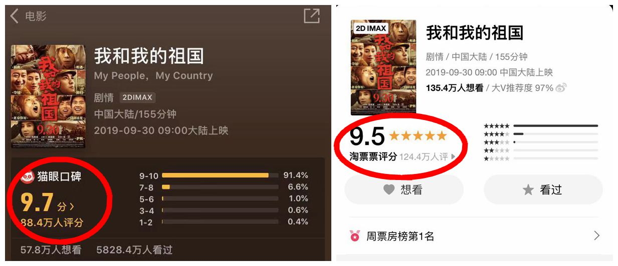《我和我的祖国》在猫眼和淘票票上的评分。来源:猫眼专业版APP、淘票票APP