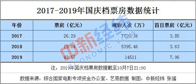 官方数据显示,2016-2018年,中国内地国庆档电影票房分别为15.8亿、26.29亿、19.04亿。另据国家电影资金办“中国电影票房APP”数据,截至10月7日21点,2019年国庆档票房超43.57亿元,创造国庆档票房新高。