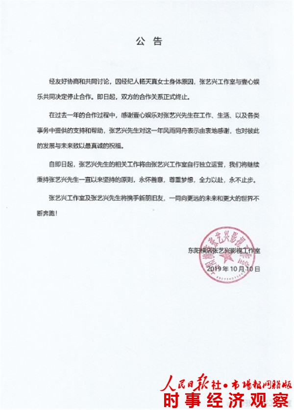 本网10月10讯(记者 李靖 赖流琴)10日,杨天真在微博发布长文,宣布与张艺兴停止合作。她表示张艺兴是满分优秀的艺人,从一个经纪人的角度, 这已是绝对完美的合作对象。但因自己身体原因无法在体力和精力上完全投入经纪人工作,因此正式公告此事。随后,张艺兴转发微博致谢杨天真,并叮嘱其照顾好身体,张艺兴工作室也发布公告,宣布与壹心娱乐的合作关系正式终止。此前张艺兴曾于7日生日时在绿洲发文表示“新的开始”。