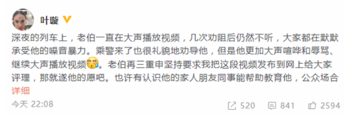 10月10日,叶璇深夜乘坐从南京前往杭州的高铁时,遇到后排一男子大声外放视频,叶璇上前制止,但该男子并没有听劝,叶璇也曾希望通过乘务员,乘警来解决此事,但几番劝阻都没有用,更让人没有想到的是该男子还出言不逊地骂了叶璇:“神经病,你这个人”,十分无畏不屑的模样。