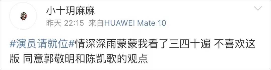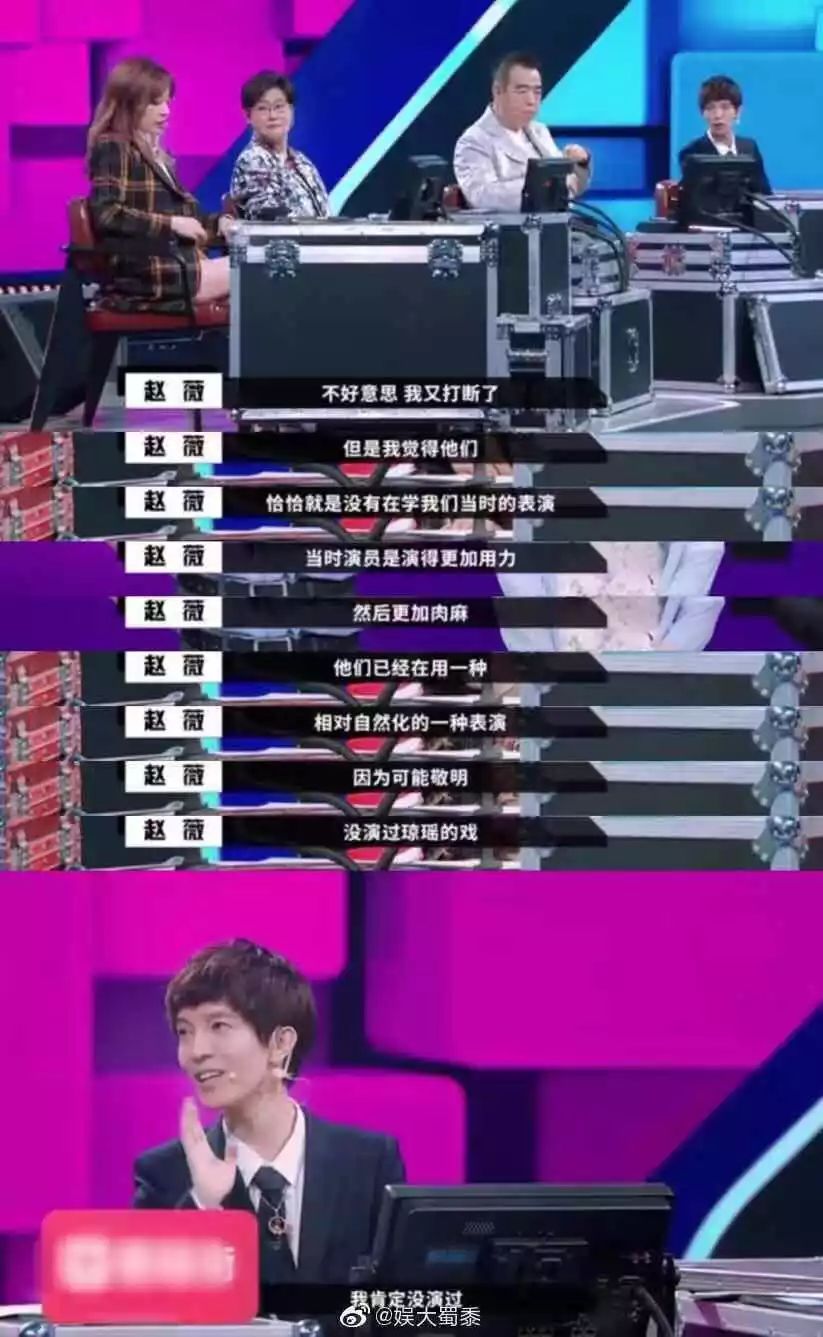 但其他导师则持不同的看法。比如,曾饰演依萍一角的赵薇认为,两人演得非常好,因为琼瑶的影视作品有非常强烈的个人风格,“琼瑶的戏有一种魔力,会让演员神经质”,她直言,演员演得很自然,“当时的演员更加用力、更加肉麻”;