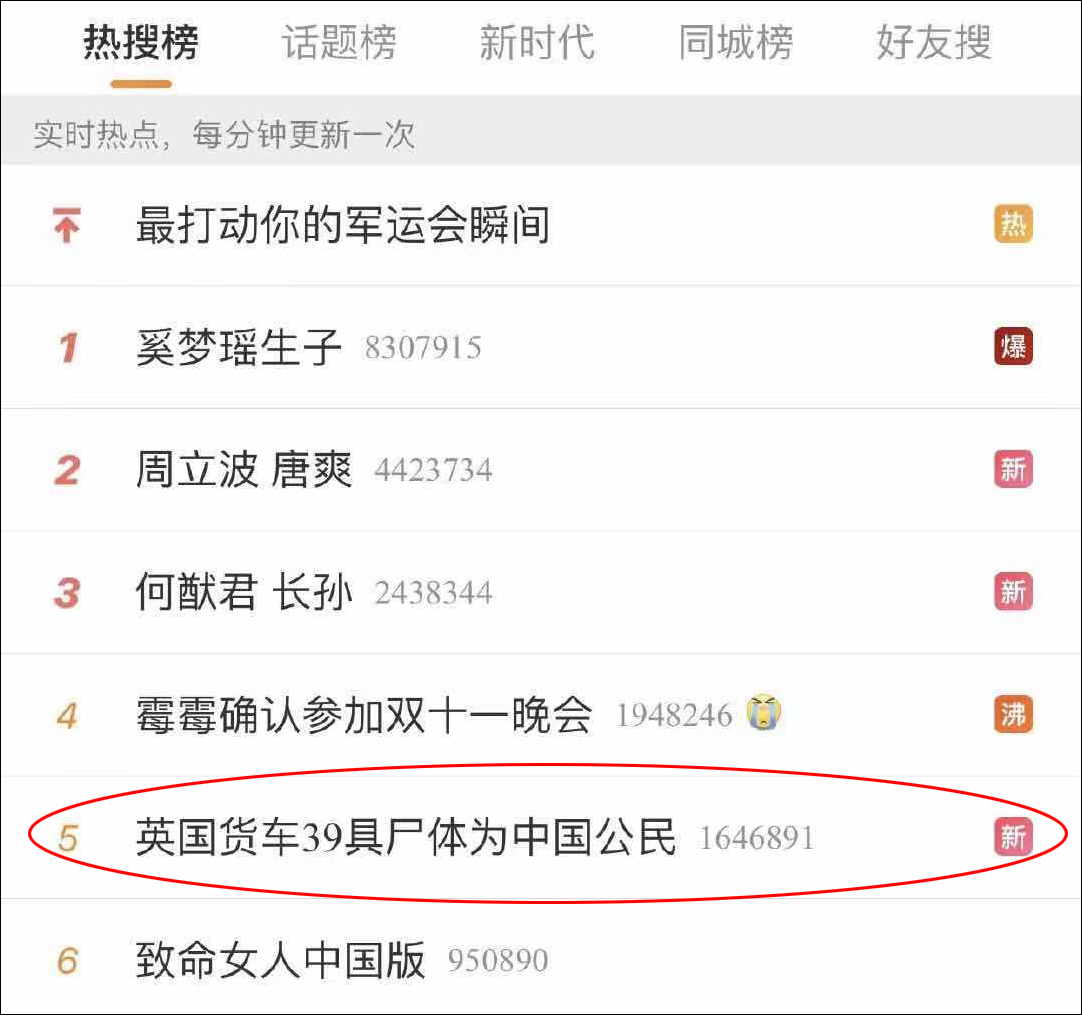 在他发布的“热搜榜”中,可以看到,奚梦瑶生子达到了“爆”的程度,而“英国货车39具尸体为中国公民”这样重大的新闻竟然只是个“新”。