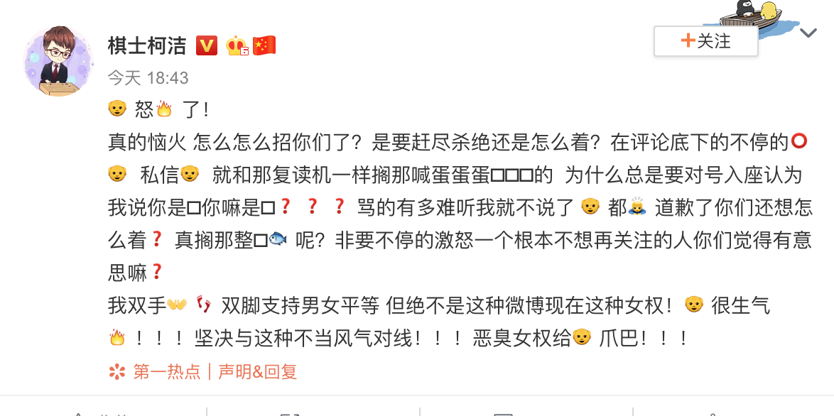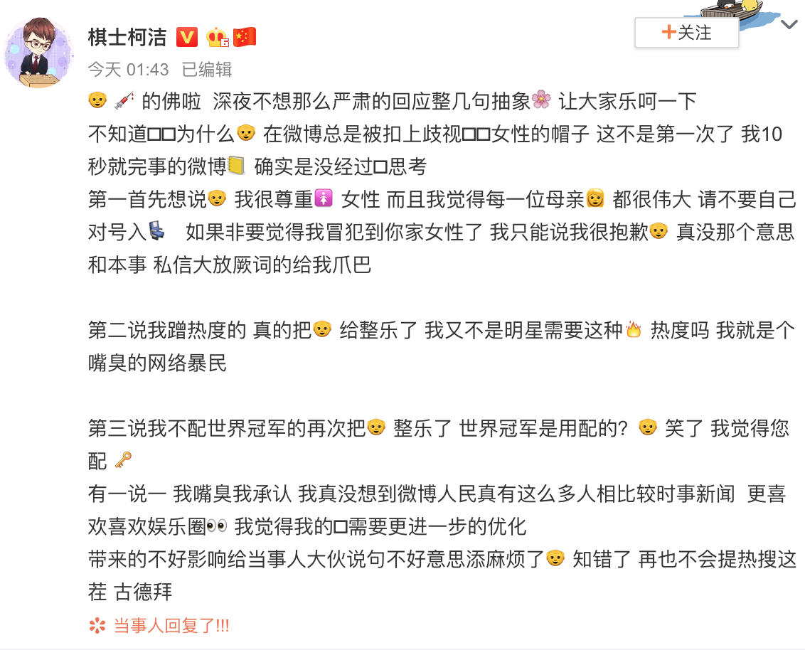 搜狐娱乐讯 10月24日,奚梦瑶生子的新闻引爆热搜,围棋选手柯洁发文质疑,称“卧佛了,热搜两个完全不知道是谁的人下个蛋, 显示个爆?是蛋爆了嘛?”引发网友争议。 来源:搜狐娱乐 |