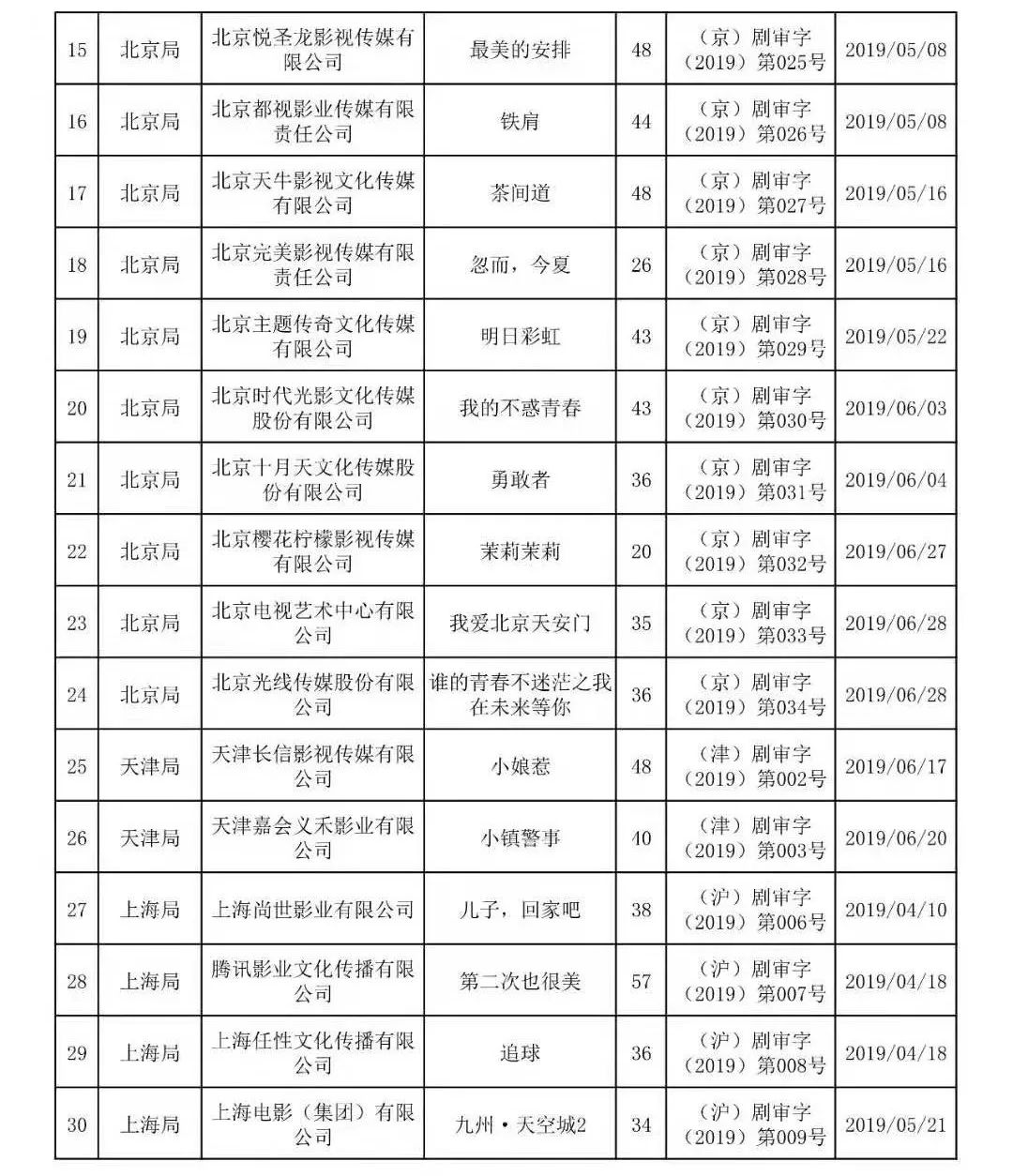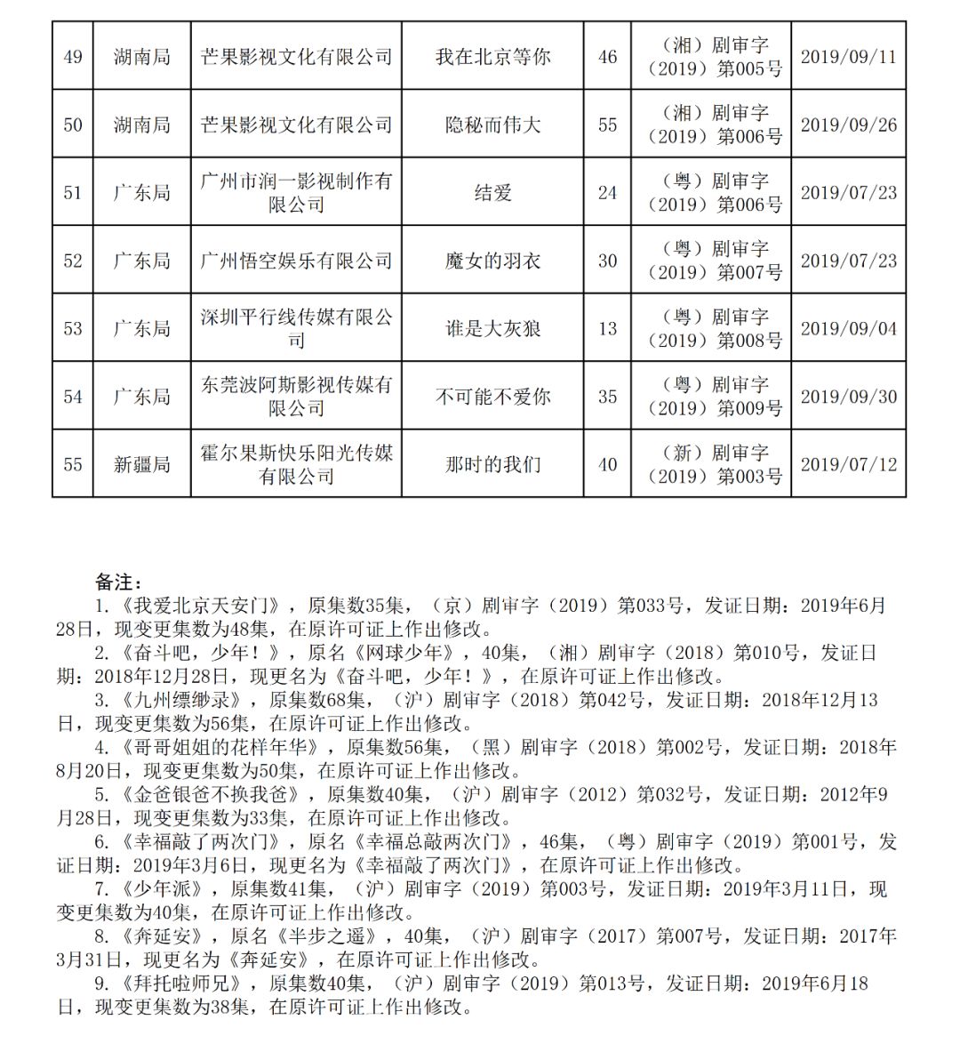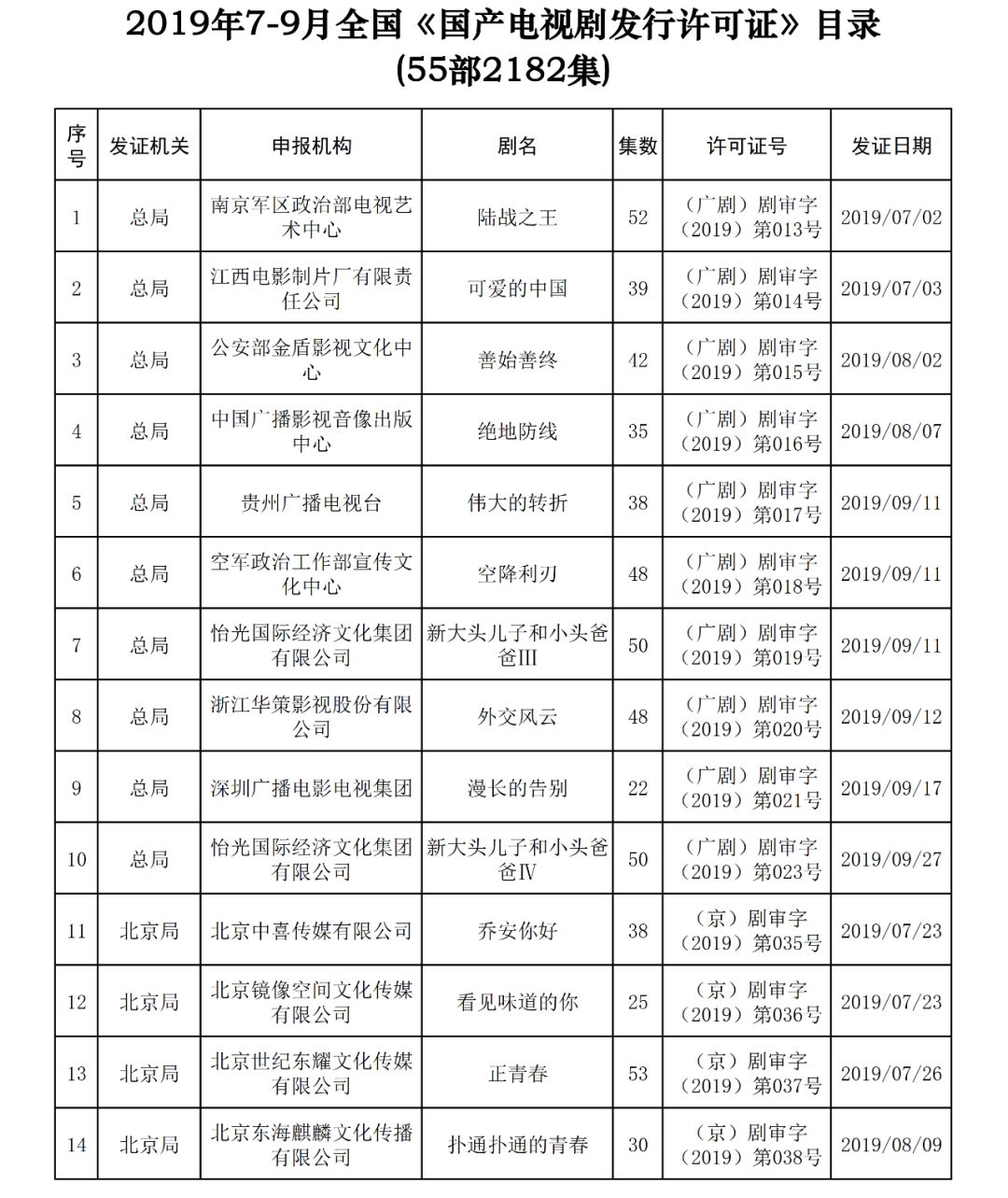 《通告》显示,2019年7-9月,全国各类电视剧制作机构共计生产完成并获准发行国产电视剧55部2182集。