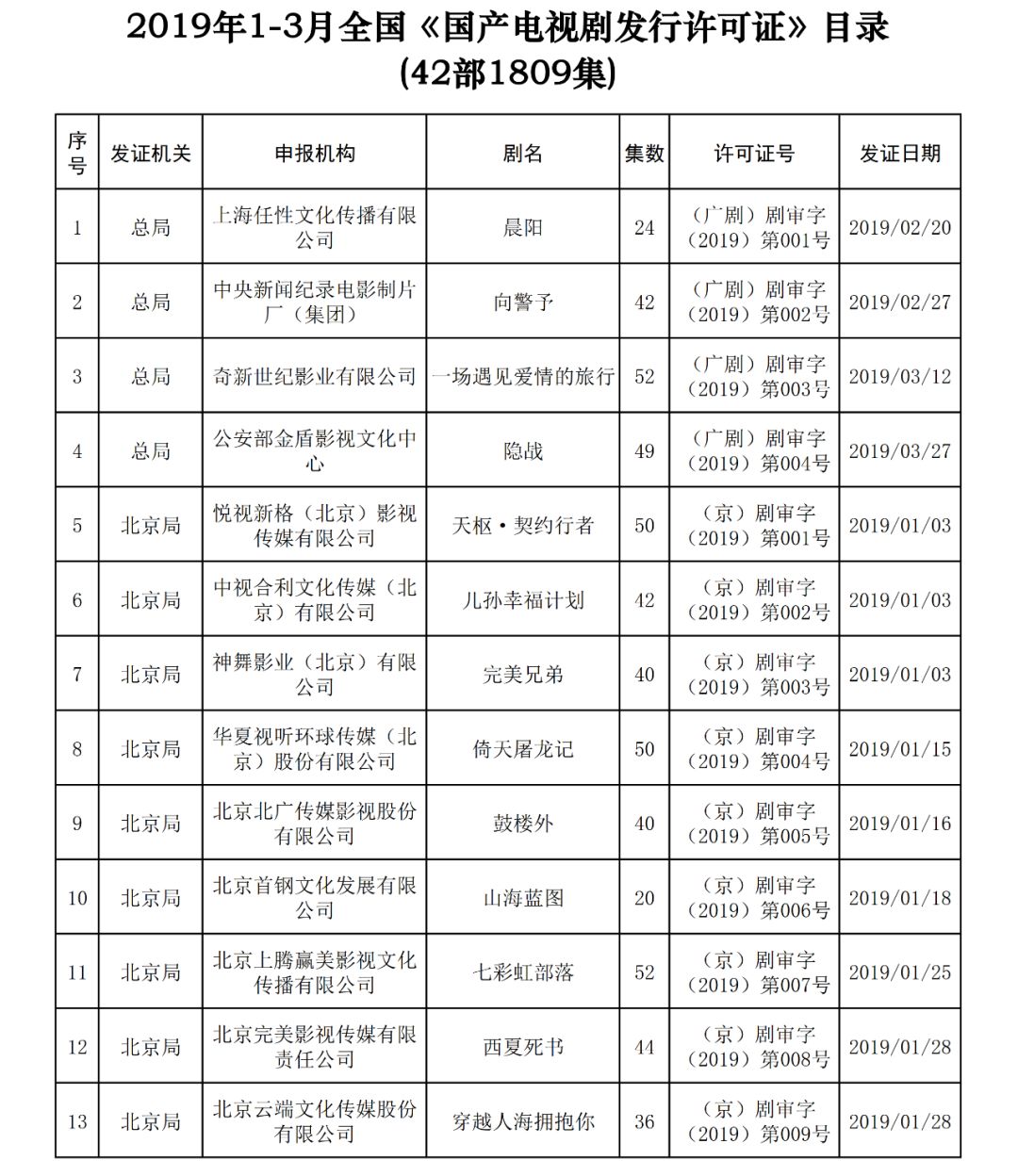 2019年1-3月,全国各类电视剧制作机构共计生产完成并获准发行国产电视剧42部1809集。