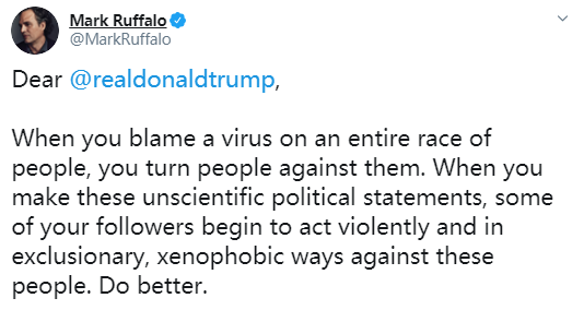 “亲爱的唐纳德·特朗普,当你把病毒归咎于一整个种族时,你就是在煽动人们敌视他们。当你说出这些反科学政治言论时,你的一些追随者就开始逞凶,并且以排外、仇外的方式敌视这些人。请做些好点的事吧。”